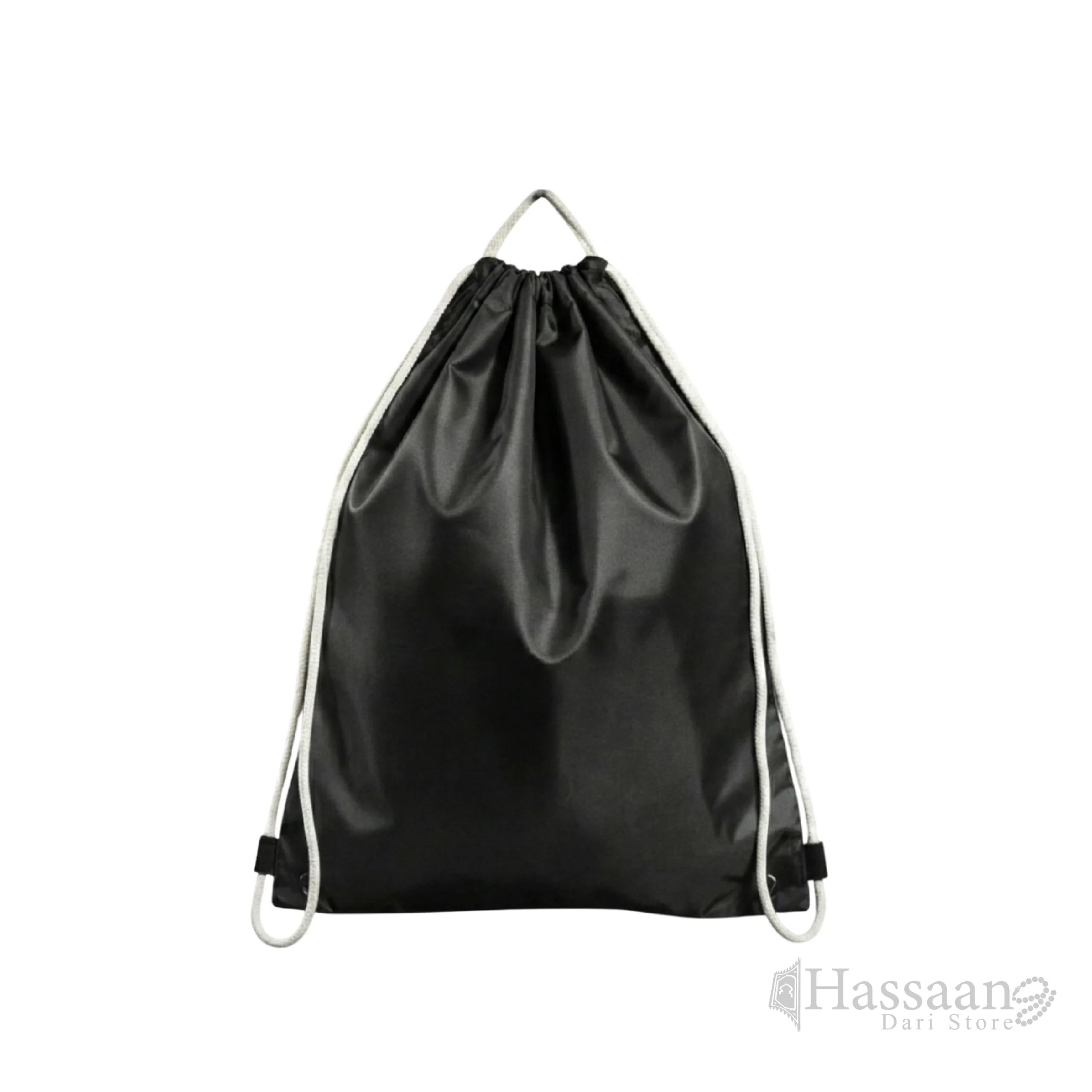The bag features strong white drawstring pull cords that also function as shoulder straps, offering a secure and hands-free carrying experience. Its spacious interior easily accommodates Ihram accessories, slippers, water bottle, mobile phone, medicines, and prayer items—keeping everything organized and within easy reach.